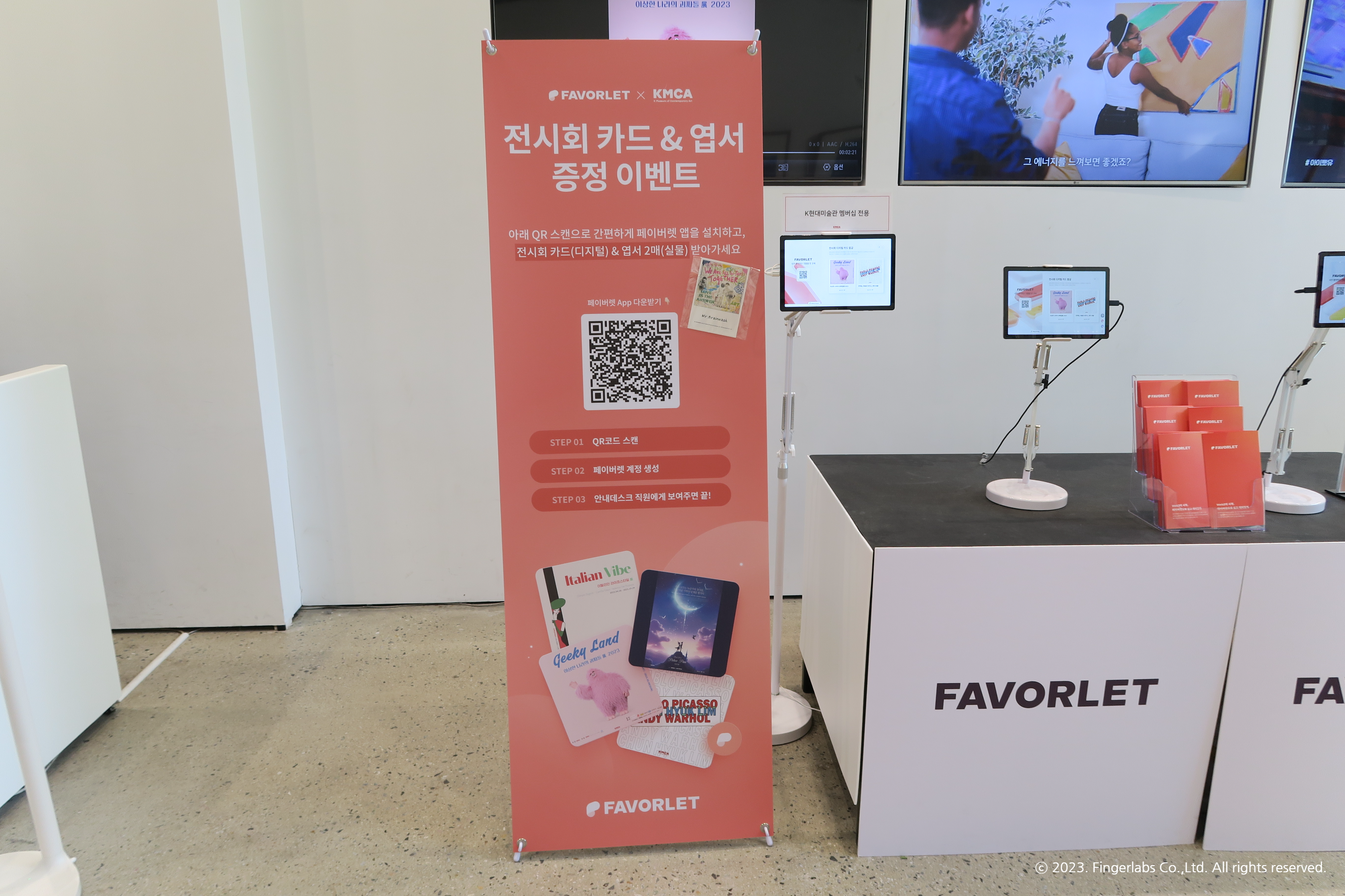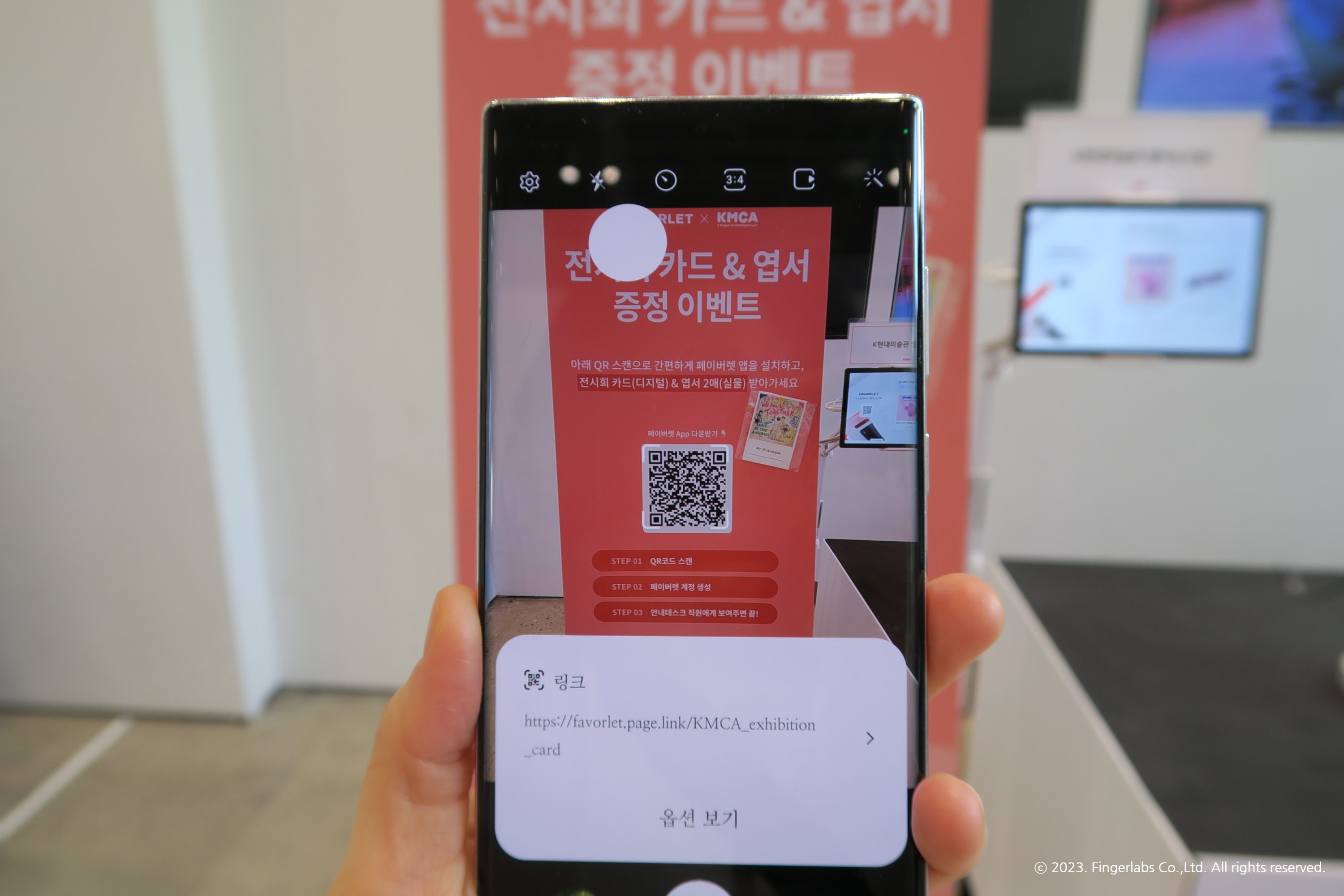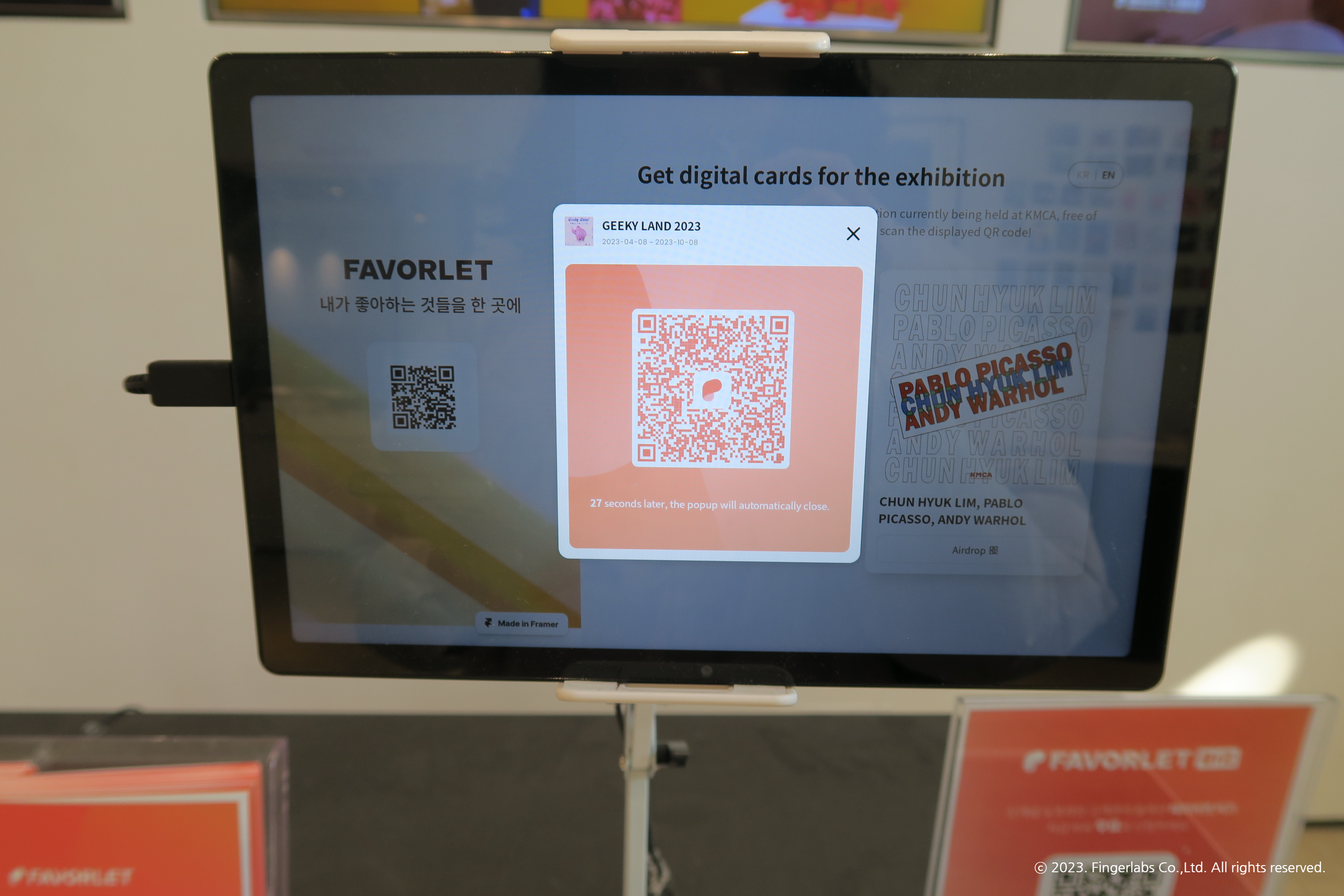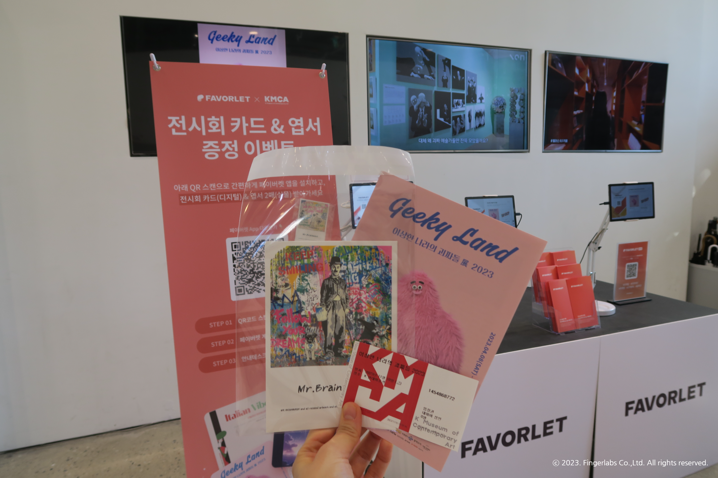 페이버렛 부스는 괴짜전, 전혁림전등을 보러 K현대미술관을 방문하신 관람분들에게 편리한 콜렉팅 서비스를 드리기 위해 마련 되었어요. QR 스캔하여 페이버렛 앱을 설치하면 디지털로 된 전시회 카드와 실물 엽서를 주는 이벤트를 진행하고 있습니다. K현대미술관을 방문했다가 페이버렛 앱을 처음 본 분들도 많을 것 같아요.