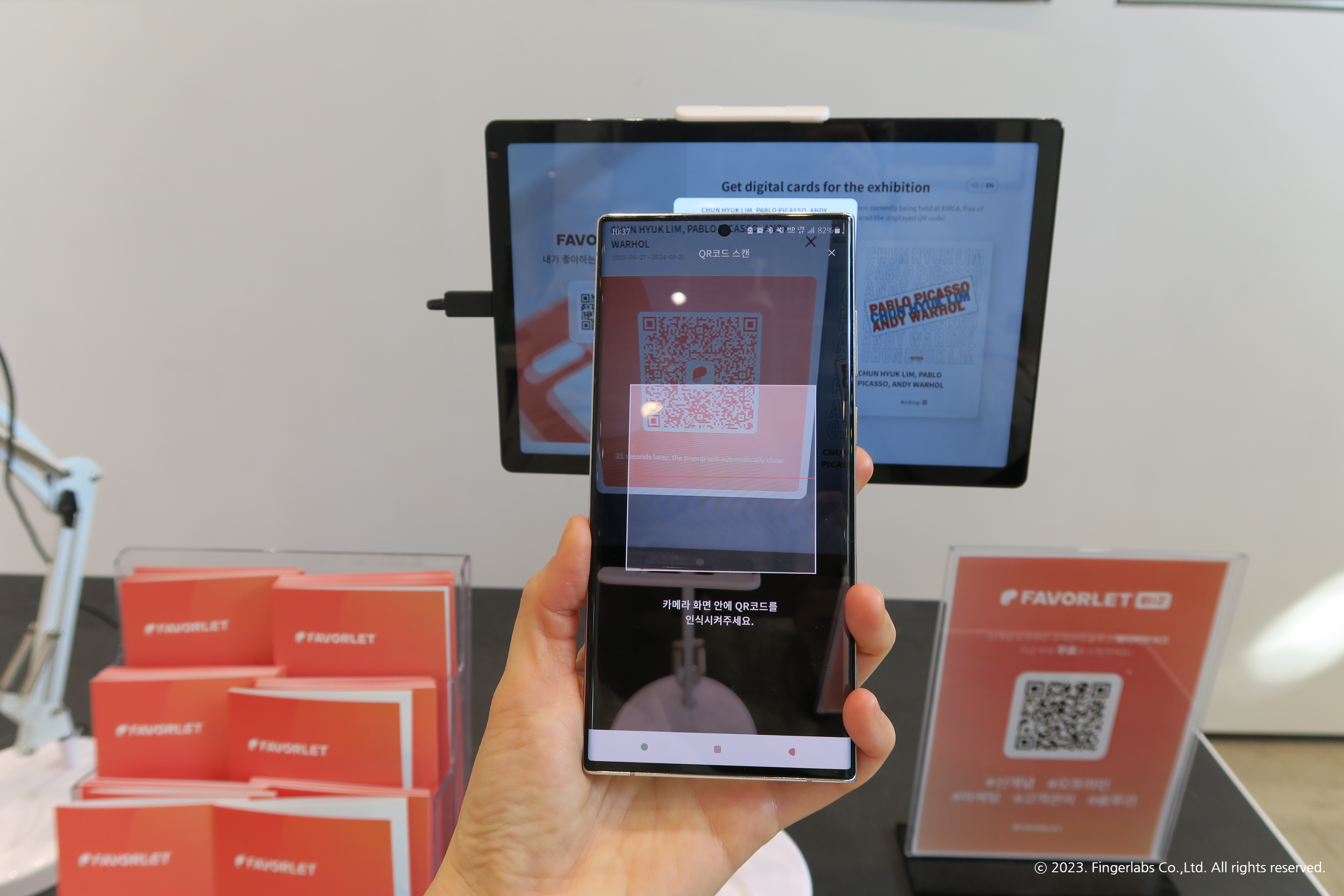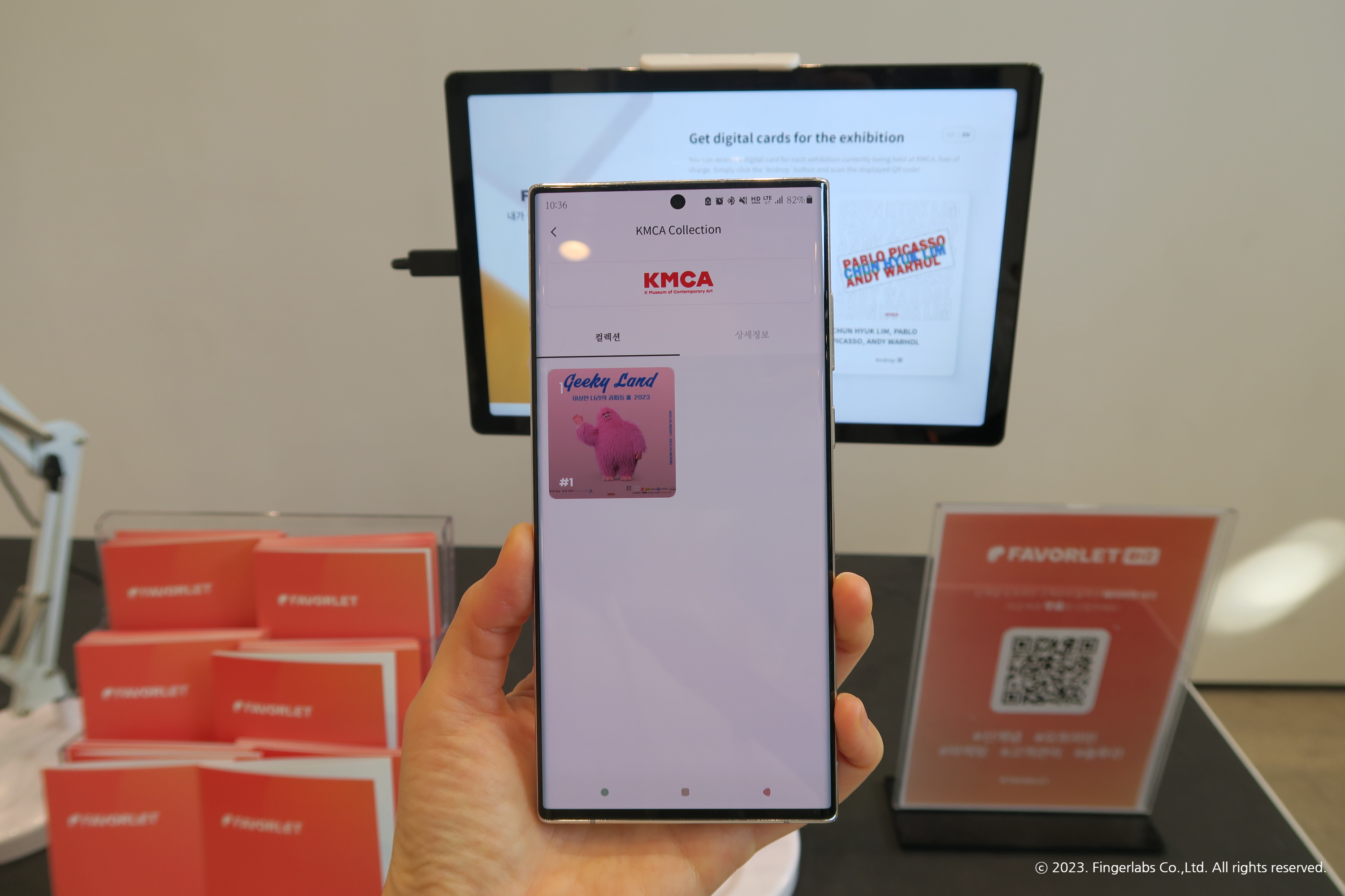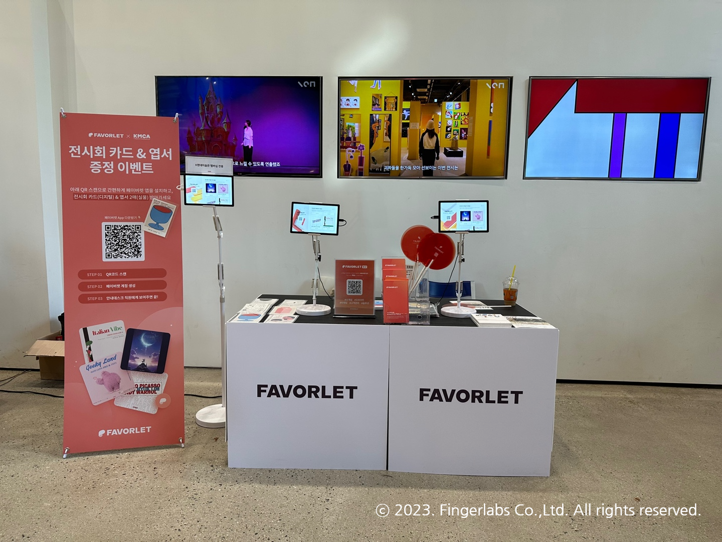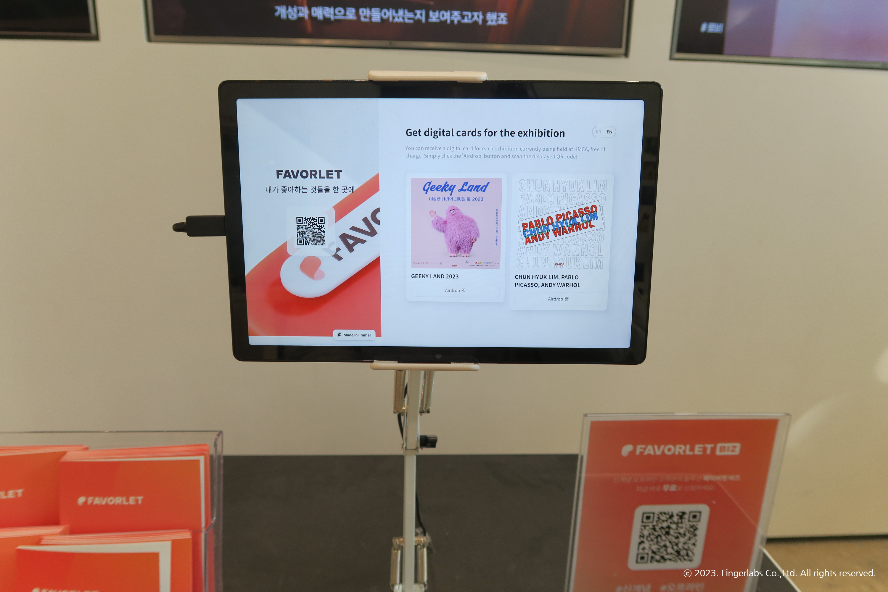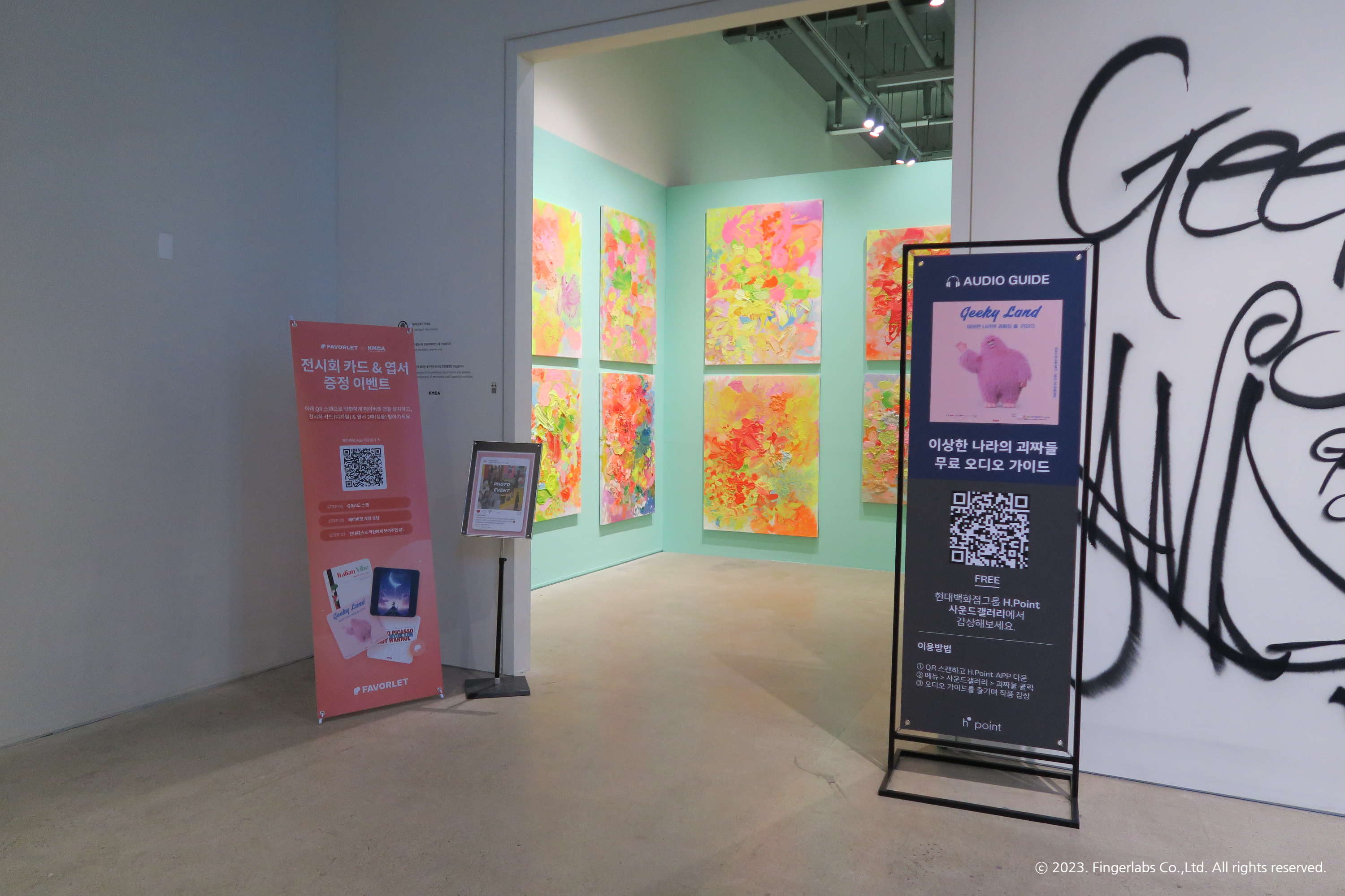 페이버렛 부스는 괴짜전, 전혁림전등을 보러 K현대미술관을 방문하신 관람분들에게 편리한 콜렉팅 서비스를 드리기 위해 마련 되었어요. QR 스캔하여 페이버렛 앱을 설치하면 디지털로 된 전시회 카드와 실물 엽서를 주는 이벤트를 진행하고 있습니다. K현대미술관을 방문했다가 페이버렛 앱을 처음 본 분들도 많을 것 같아요.